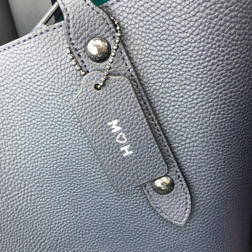 Over the last few years, I have slowly been trying to add navy instead of black to my basic neutral wardrobe. While September is still a few weeks away, I introduced something new to my accessory wardrobe – a Coach Market Tote in Navy with a Teal coloured lining. I had been looking for a navy purse and/or bag for awhile and happened upon this beautiful one when I recently popped into a Coach store for a look. I consider myself a poster girl and brand ambassador for Coach as I have owned and loved their leather goods for more than two decades. It was love at first site when I saw this tote. I love its versatility – one can open it completely as a tote or close the centre clasp for a purse look. It has a few inside pockets for your mobile or transit pass and a large zippered pocket too. Since I often stop on my way home from work, I needed something to put my work tablet in to bring it with me on the go and this bag is perfect for that. I am also a shutterbug and have been wanting to use my Canon Camera DSLR more often and this tote allows me to take it on my local travels. I love that Coach now allows you personalize your own hang tag. I kept it simple with my initials with a heart to balance them in between. I am always doodling hearts and I love the heart symbol as it represents love and sharing kindness with the world.
