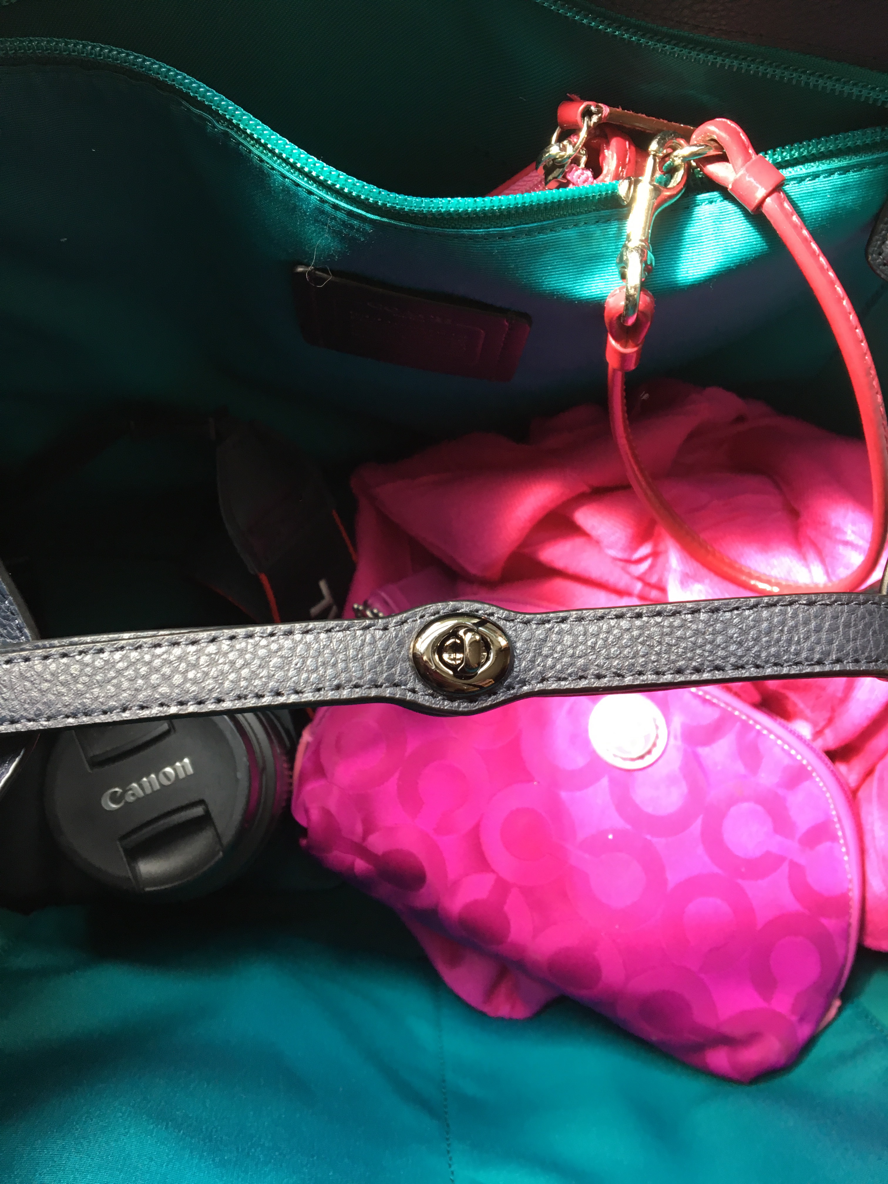 Over the last few years, I have slowly been trying to add navy instead of black to my basic neutral wardrobe. While September is still a few weeks away, I introduced something new to my accessory wardrobe – a Coach Market Tote in Navy with a Teal coloured lining. I had been looking for a navy purse and/or bag for awhile and happened upon this beautiful one when I recently popped into a Coach store for a look. I consider myself a poster girl and brand ambassador for Coach as I have owned and loved their leather goods for more than two decades. It was love at first site when I saw this tote. I love its versatility – one can open it completely as a tote or close the centre clasp for a purse look. It has a few inside pockets for your mobile or transit pass and a large zippered pocket too. Since I often stop on my way home from work, I needed something to put my work tablet in to bring it with me on the go and this bag is perfect for that. I am also a shutterbug and have been wanting to use my Canon Camera DSLR more often and this tote allows me to take it on my local travels. I love that Coach now allows you personalize your own hang tag. I kept it simple with my initials with a heart to balance them in between. I am always doodling hearts and I love the heart symbol as it represents love and sharing kindness with the world.