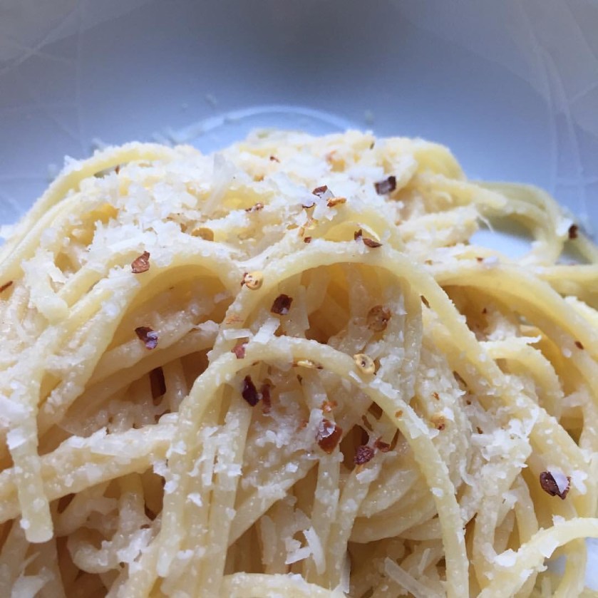 Simple Spaghetti  Cook spaghetti as per package. Heat olive oil in a pan. Sauté garlic and red chilli flakes and cook until fragrant. Drain spaghetti, add to olive oil mixture and toss to coat. Sprinkle with Parmesan cheese.
