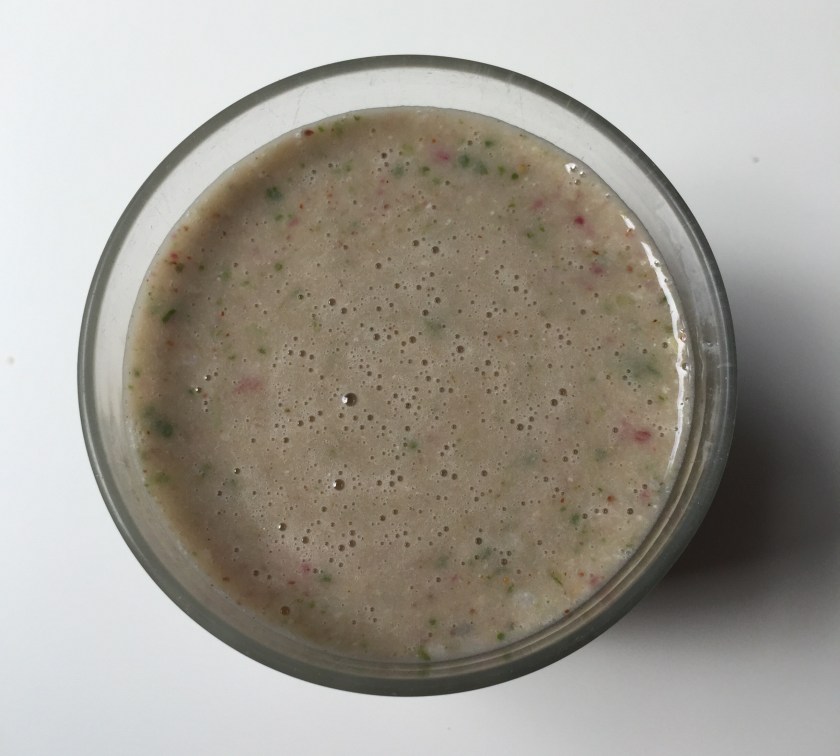 Today’s smoothie creation – one banana, a handful of frozen strawberries and baby spinach, approximately 1 tablespoon almond butter as well as hemp hearts, a teaspoon of coconut oil and unsweetened almond milk. I added a wee bit of cinnamon too. Blend and enjoy!