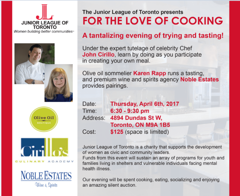 If the answer to one or more is a definite YES, please join us for the Junior League of Toronto For The Love of Cooking event on the evening of Thursday April 6th. The evening will include hands-on cooking lessons and dinner led by Chef John Cirillo (a former head of Canada’s culinary Olympics team) and his team. Olive Oil Sommelier Karen Rapp will run a tasting and Noble Estates will provide wine pairings. A silent auction and special surprises are also in store. This event is open to Junior League of Toronto, friends and the Toronto community. Men are also most welcome to join us too. Please share with anyone you think may be interested.